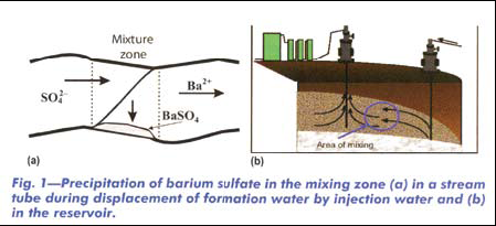 對于生產井的地層損害而言,硫酸鋇沉淀是其主要物理機理。通常海上油田注水水源是海水,海水中富含陰離子。如果地層水包含陽離子,經混合注入后,地層水會出現硫酸鋇沉淀(見圖1)。同樣反應發生于硫酸鹽陰離子和鍶、鈣或其它金屬陽離子之間。地層水與海水的混合區域內易發生硫酸鹽沉淀。注水時在注水井到生產井井底地間之間所形成的混合區域持續向生產井方向移動(即當混合區域經過井網時,其在很短時間內會在油藏井網內形成聚集(Fig.1b)。混合區域移動所形成的沉淀就地層孔隙空間而言,僅占一小部分,并不能降低地層滲透率。地層水/海水持續混流至生產井區域,而生產井所產出液中包括來自高滲透地層的注入水和來自